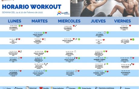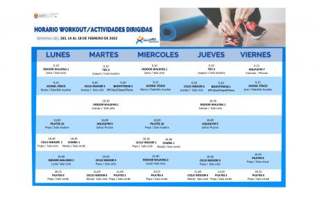 Esta semana (14/02 al 19/02), la Concejalía de Deportes propone su calendario semanal para todos aquellos inscritos en el «Programa de WorkOut Training» con actividades de jornada de mañana y tarde de entrenamiento de ciclo indoor, elíptica además del trabajo funcional, trabajo fuerza, core, resistencia y movilidad articular.