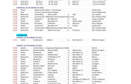 Este fin de semana (04-05-06/Marzo) San Javier vuelve a ser sede de eventos deportivos de importancia regional: en primer lugar, el Mar Menor FC recibe al Mancha Real; El Pabellón de La Manga albergará el Campeonato Regional de Patinaje Artístico, la Federación de Baloncesto elige el polideportivo municipal para concentrar a los benjamines tras dos años de obligado parón, las pistas de tenis acogen la 2ª Fase del Circuito Promesas. Además, todo el deporte y citas habituales del municipio.