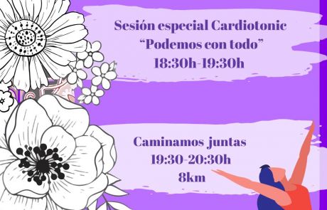 Desde la Concejalía de Deportes del Ayto. de San Javier se propone, con motivo del día “8M” Día Internacional de la Mujer, disfrutar de dos sesiones especiales: La primera, de Cardiotonic “Podemos con todo” con horario de 18.30h. a 19.30h. y la segunda, “Caminando juntas”, de 19:30h. a 20:30h. Una actividad programada de 8 kms.