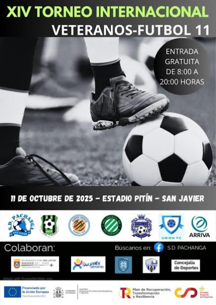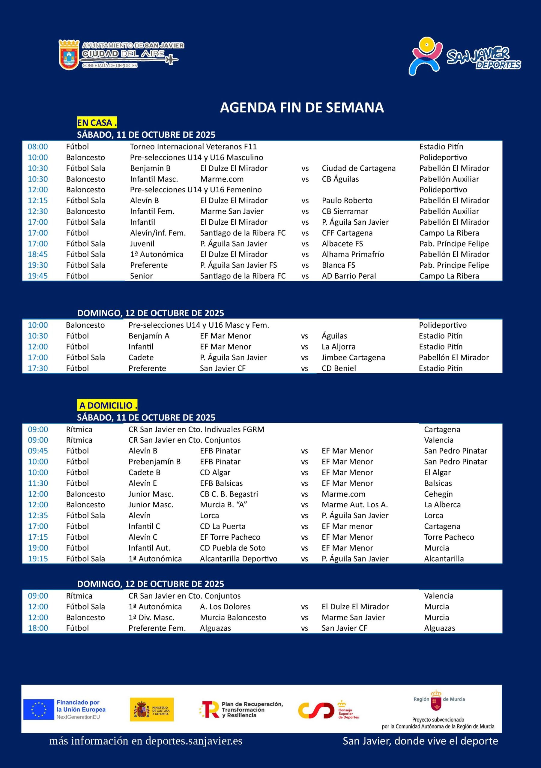 Este fin de semana (11/12-Octubre), el fútbol es el protagonista: San Javier acoge el XIV Torneo Internacional de Veteranos de Fútbol 11, de la SD Pachanga, el sábado a partir de las 08h., en el Estadio Pitín; Además, el domingo, se celebrará el partido del Mar Menor contra el Beniel a las 17.30h., y en el Campo de la Ribera, el Riber se enfrenta al Barrio Peral, el sábado a las 19.45h.; Además es de destacar, las concentraciones de Baloncesto de la Federación durante todo el fin de semana y las citas habituales de los clubes.