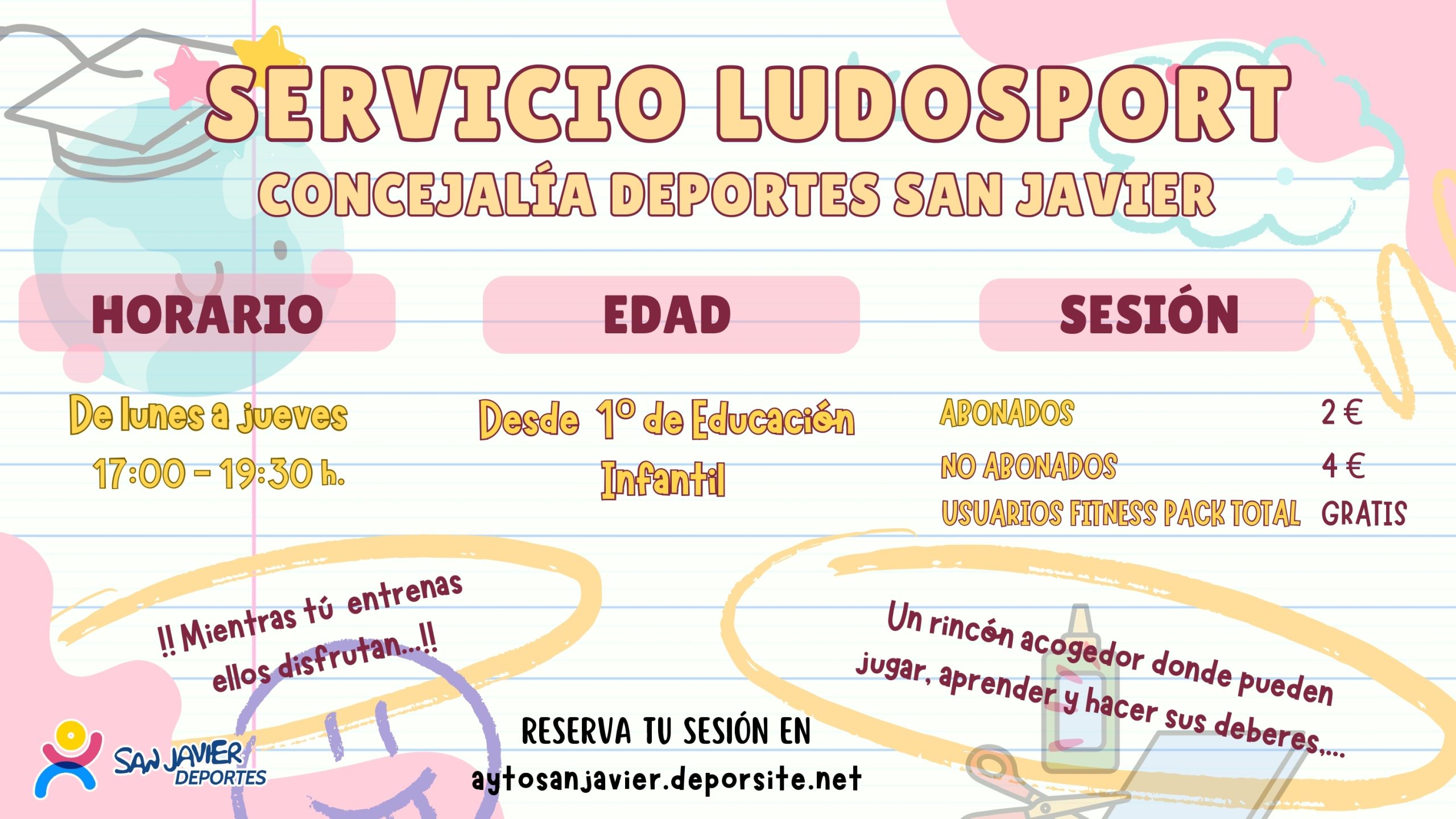La Concejalía de Deportes del Ayto. de San Javier ha puesto en marcha en el día de ayer, miércoles 1 de octubre, el “Servicio de LudoSport”, con el objetivo de facilitar la conciliación de la vida familiar y la práctica del deporte: Para ello, la Concejalía propone a todas aquellas familias interesadas en disfrutar de su deporte preferido en el Polideportivo, mientras sus retoños están cuidados por un técnico cualificado, que lo motivará para participar activamente en diferentes juegos, actividades lúdicas y hacer sus deberes.
