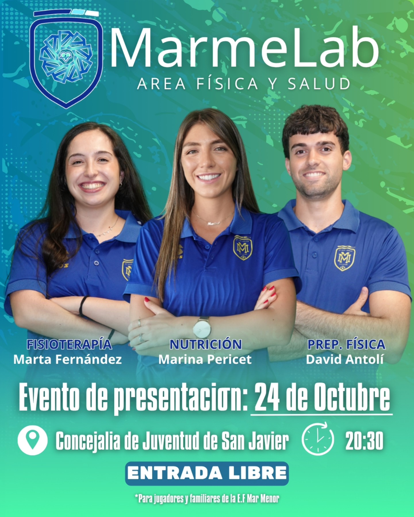 La Escuela de Fútbol Mar Menor lanza una nueva idea, destinada a ser un éxito rotundo, que se presentará el próximo viernes 24 de octubre, en la Concejalía de Juventud de San Javier, a las 20.30h. : Se trata de MarMeLab – Área Física y Salud, una nueva sección que pivotará sobre tres “pilares fundamentales: Fisioterapia, Nutrición y Preparación Física”.