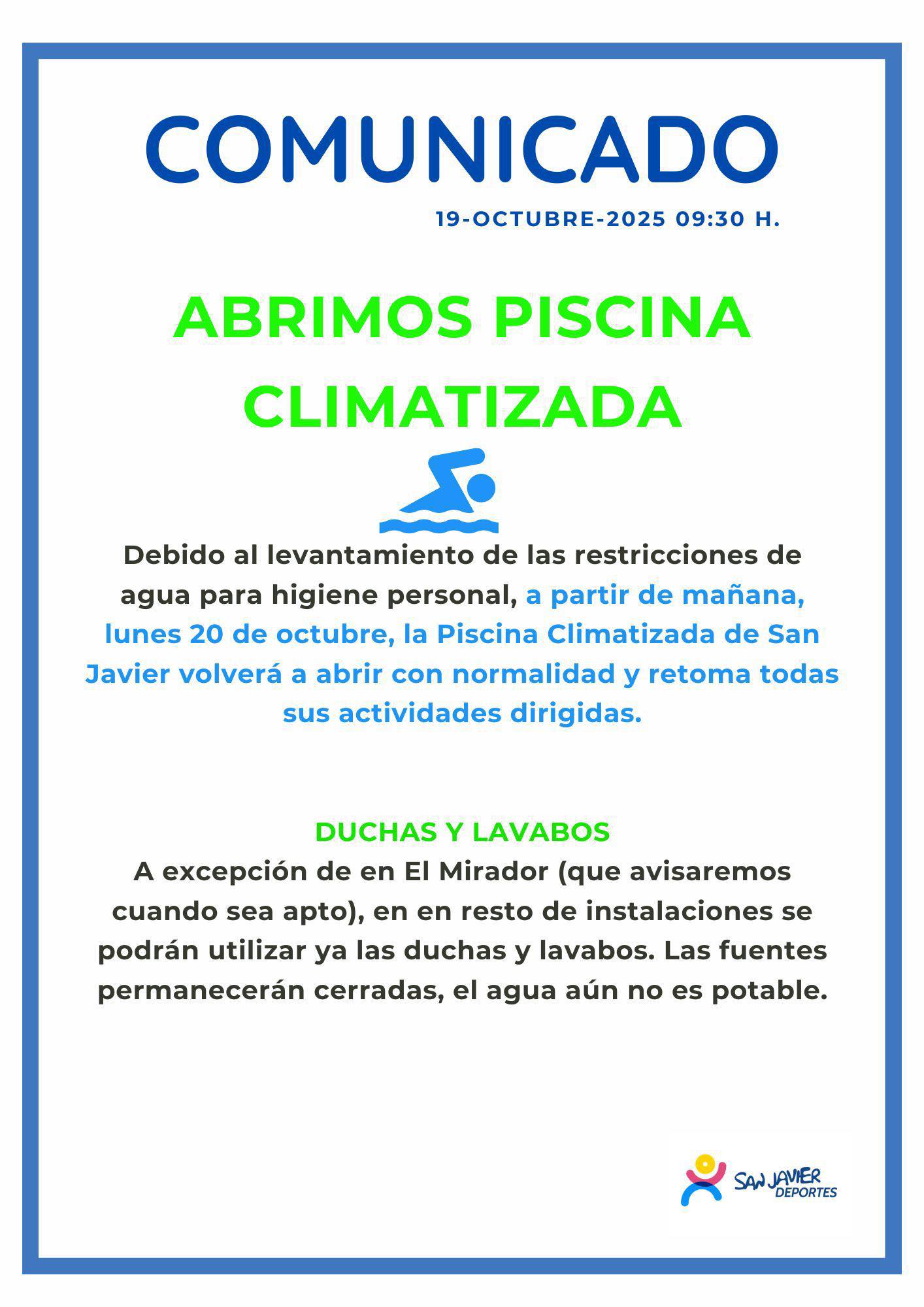 Reinicio de las actividades de la piscina Hoy, lunes 20 de octubre, se retoma la actividad de la piscina climatizada con normalidad. Gracias por su comprensión. Comparte esta noticia en: Rafa2025-10-20T11:29:48+02:00 Artículos relacionados Natación. El Teatro de Invierno acogió la Gala Anual de la Federación, en una fiesta inolvidable para el deporte sanjaviereño Galería Natación. El Teatro de Invierno acogió la Gala Anual de la Federación, en una fiesta inolvidable para el deporte sanjaviereño lunes, 20 octubre, 2025 Publicadas las bases específicas para la bolsa de Trabajo de Técnico Deportivo Galería Publicadas las bases específicas para la bolsa de Trabajo de Técnico Deportivo lunes, 20 octubre, 2025 Motociclismo. El sanjaviereño Julen Hernández, segundo en la prueba clave de Zaragoza Galería Motociclismo. El sanjaviereño Julen Hernández, segundo en la prueba clave de Zaragoza lunes, 20 octubre, 2025 Halloween Party 2025: Ciclo indoor y Bottcamp Galería Halloween Party 2025: Ciclo indoor y Bottcamp lunes, 20 octubre, 2025