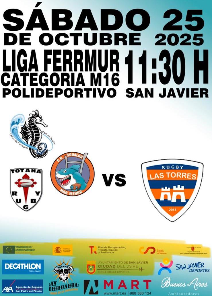 El Campo de rugby de San Javier, acogerá, el próximo sábado, 25 de octubre, a las 11.30h., el choque de la Liga de la Federación de Rugby de la Región de Murcia, de categoría M16, entre los equipos de CR Campo de Cartagena, el CR Totana, Las Torres y el local CR Squalos Mar Menor.