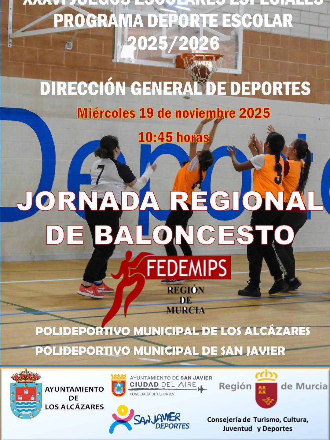 El Polideportivo de San Javier, acoge el próximo 19 de noviembre, a las 10.45h., una Jornada Regional de Baloncesto FEDEMIPS, enmarcado en el Programa de Deporte Escolar 2025/2026 de la Dirección General de Deportes.