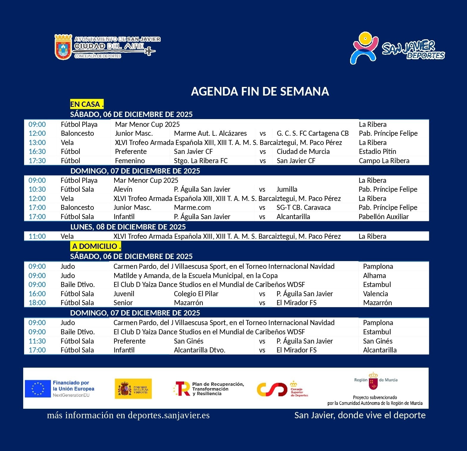 El XLVI Trofeo Armada Española, XIII Trofeo Almirante Marcial Sánchez Barcaiztegui, Memorial Paco Pérez para la clase Snipe y la XI Beach Soccer Mar Menor Cup,ambos en Santiago de la Ribera, junto con las citas habituales de este fin de semana festivo, son los eventos deportivos más destacados.