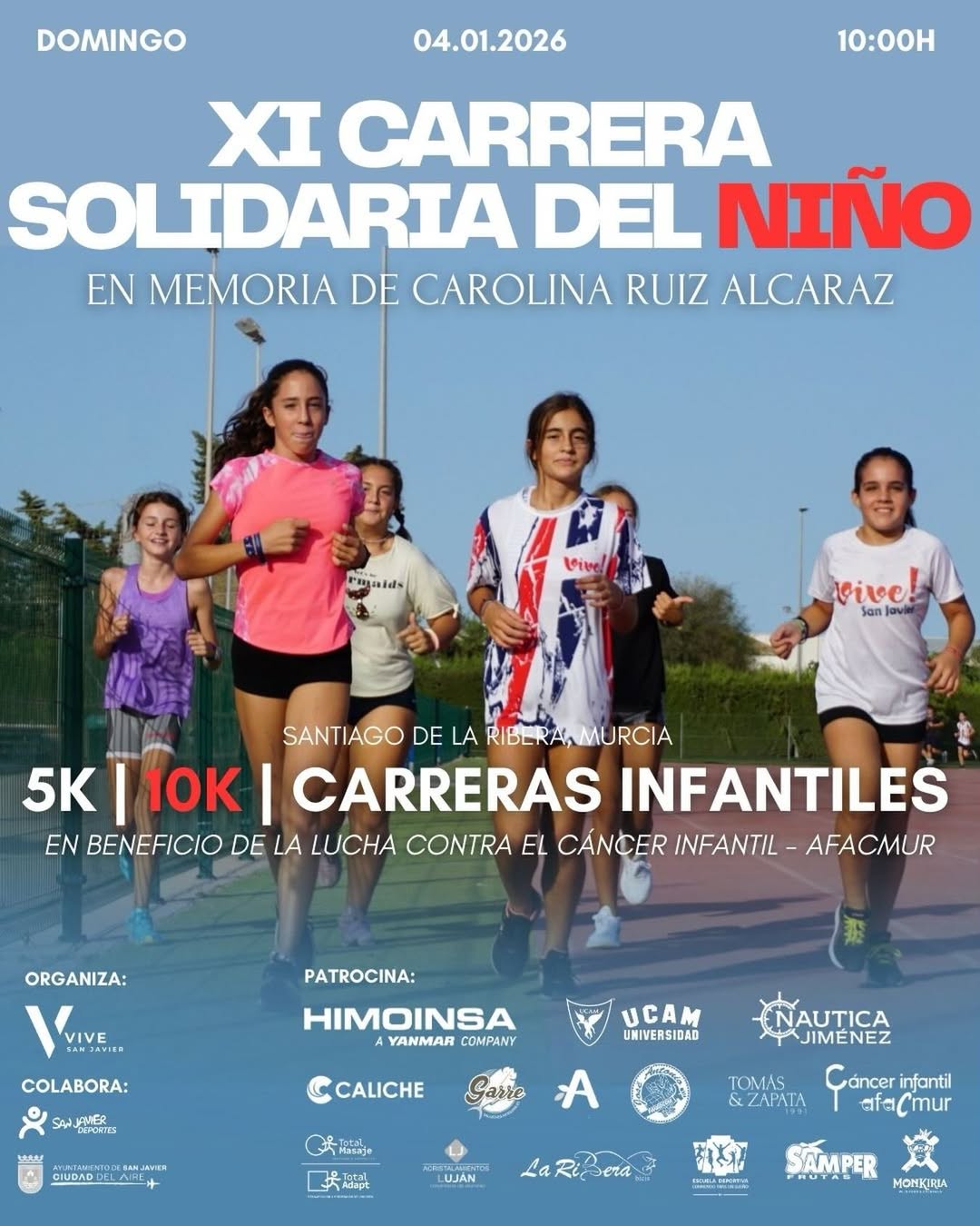 El domingo 4 de enero de 2026, se celebrará un año más, la Carrera del Niño que este año, en su XI edición, se celebrará en memoria de Carolina Ruiz Alcaraz. La recaudación de este evento, organizado por el Vive San Javier, con la colaboración de la Concejalía de Deportes, dirigida por Sergio Martínez, irá destinada a AFACMUR, Asociación de Familiares de Niños con Cáncer de la Región de Murcia.