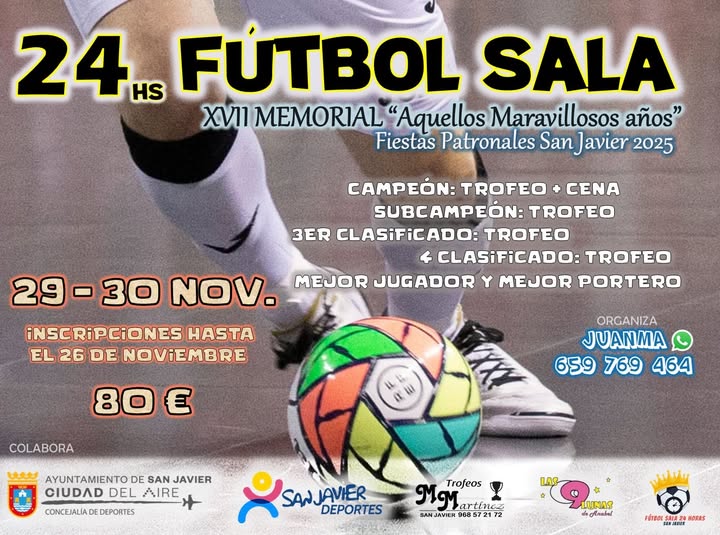 Con motivo de las Fiestas Patronales 2025, el Polideportivo municipal acogió la tradicional XVII edición del Torneo 24H Fútbol Sala San Javier en el que participaron 12 equipos procedentes de Murcia, Cartagena y otras pedanías para medirse durante todo el fin de semana.