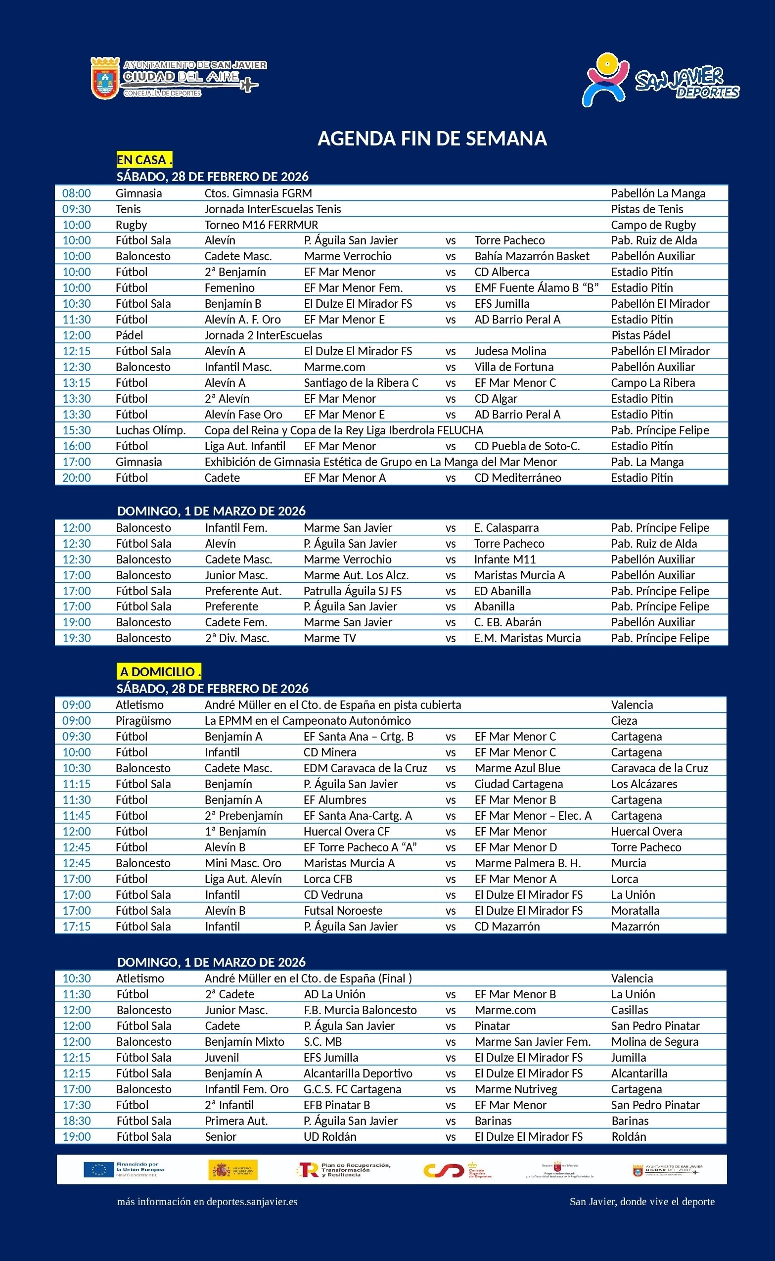 La Copa de la Reina y la Copa del Rey Liga Iberdrola en el Pabellón Príncipe Felipe de San Javier, los Campeonatos de Gimnasia Rítmica de la Federación de Gimnasia de la Región de Murcia y la participación del sanjaviereño André Müller, «el Coloso de La Manga» en el Campeonato de España de pista cubierta, así como las citas habituales de los clubes, es lo más destacado de este fin de semana deportivo (28/febrero-01/marzo)