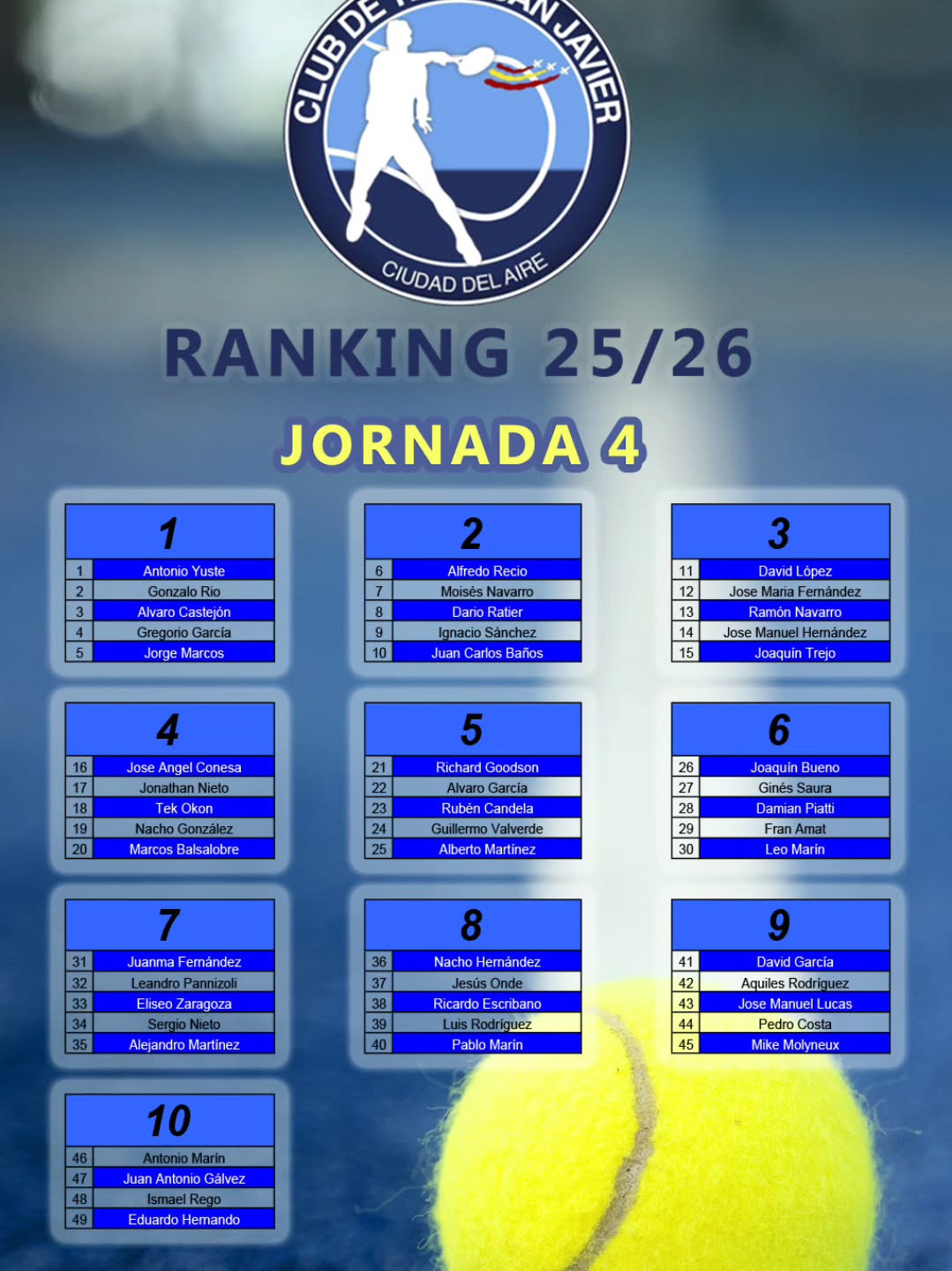Es de destacar que el club de Tenis, ha actualizado el ranking 25/26 del Club, publicando la clasificación tras la jornada nº 4.