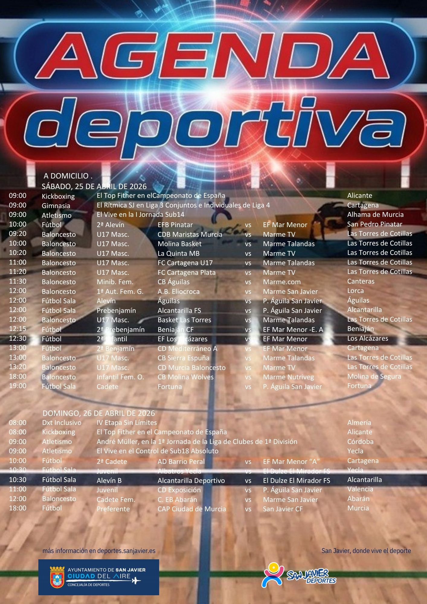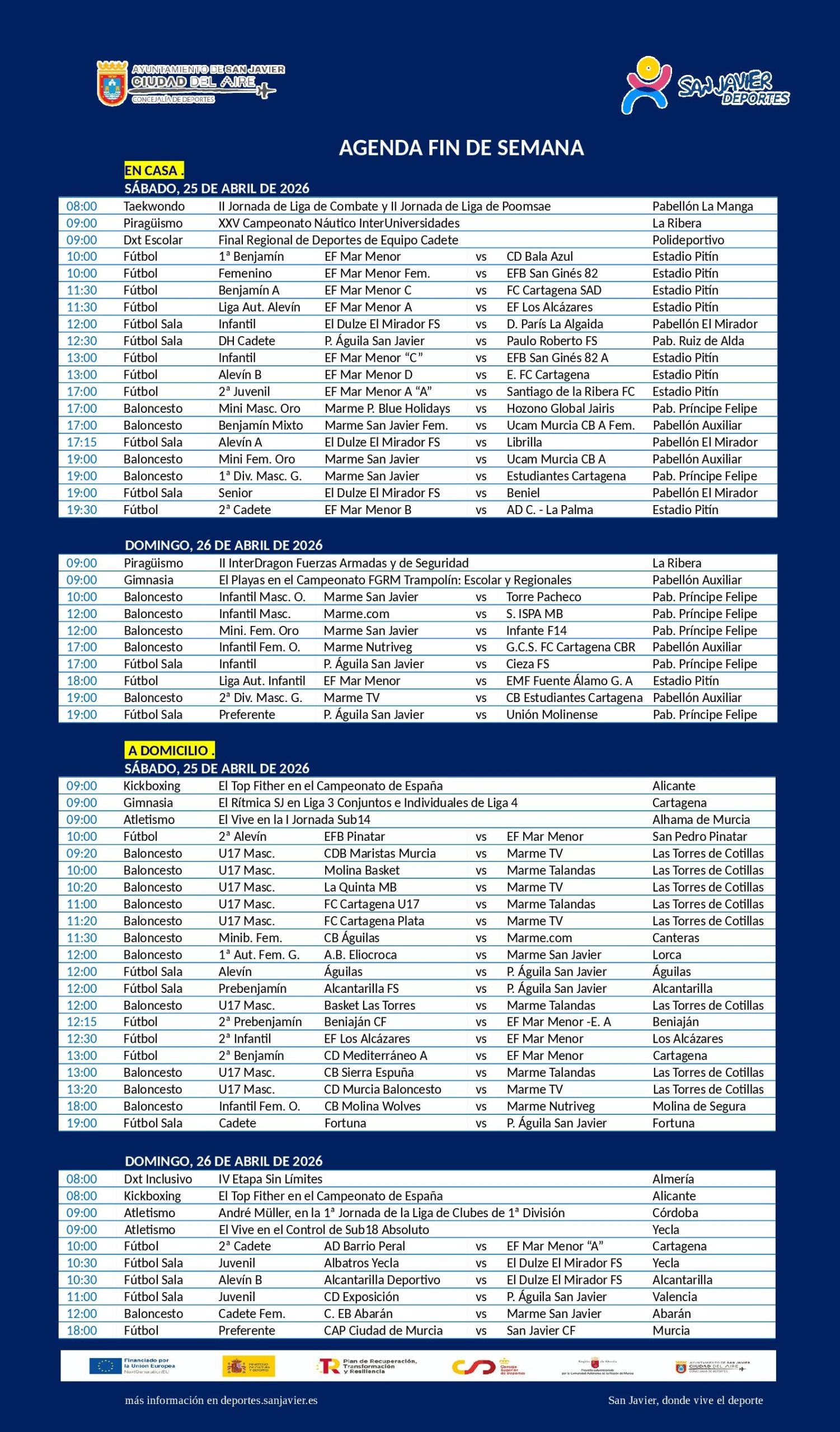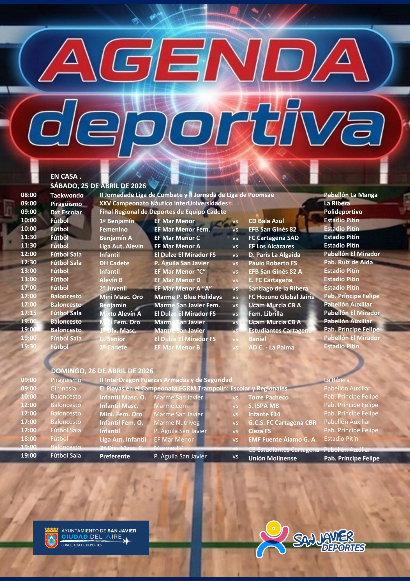 La II Regata InterDragon Fuerzas Armadas y Cuerpos de Seguridad y la InterUniversidades 25º Aniversario en La Ribera, la II Jornada de Taekwondo en La Manga del Mar Menor, el Campeonato de Trampolín Escolar y Regionales en el Pabellón Auxiliar y la Final Regional de Deportes de Equipo de categoría cadete, en el Polideportivo, el Pabellón de El Mirador y Pabellón Ruiz de Alda, así como las citas habituales de los clubes, son los eventos más destacados de este fin de semana deportivo (25/26-abril).