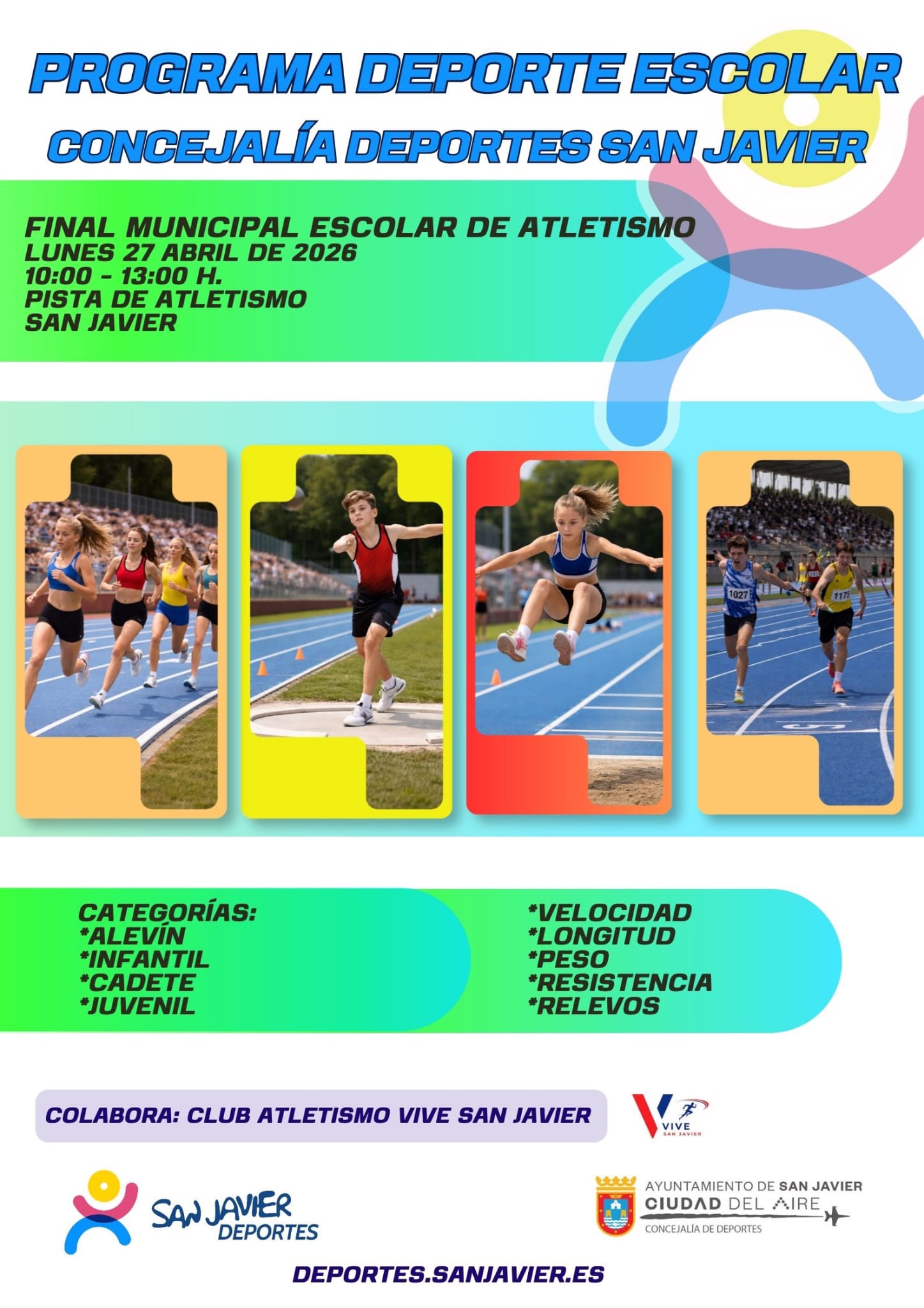 El Deporte Escolar vuelve a reunirnos en una jornada muy especial: El próximo lunes 27 de abril, la Final Municipal Escolar de Atletismo, enmarcada en el Programa de Deporte Escolar de la Concejalía dirigida por Sergio Martínez, llenará la pista “Manuel Bermúdez Fernández” de ilusión, esfuerzo y pequeños grandes momentos: Una mañana en un entorno saludable donde los “más peques” -y no tan peques-, compartirán experiencias, superarán retos y descubrirán, a través del deporte, valores que les acompañarán toda la vida. El horario será de 10 a 13h., y se contará con la colaboración del club atletismo Vive San Javier para la buena marcha del evento.