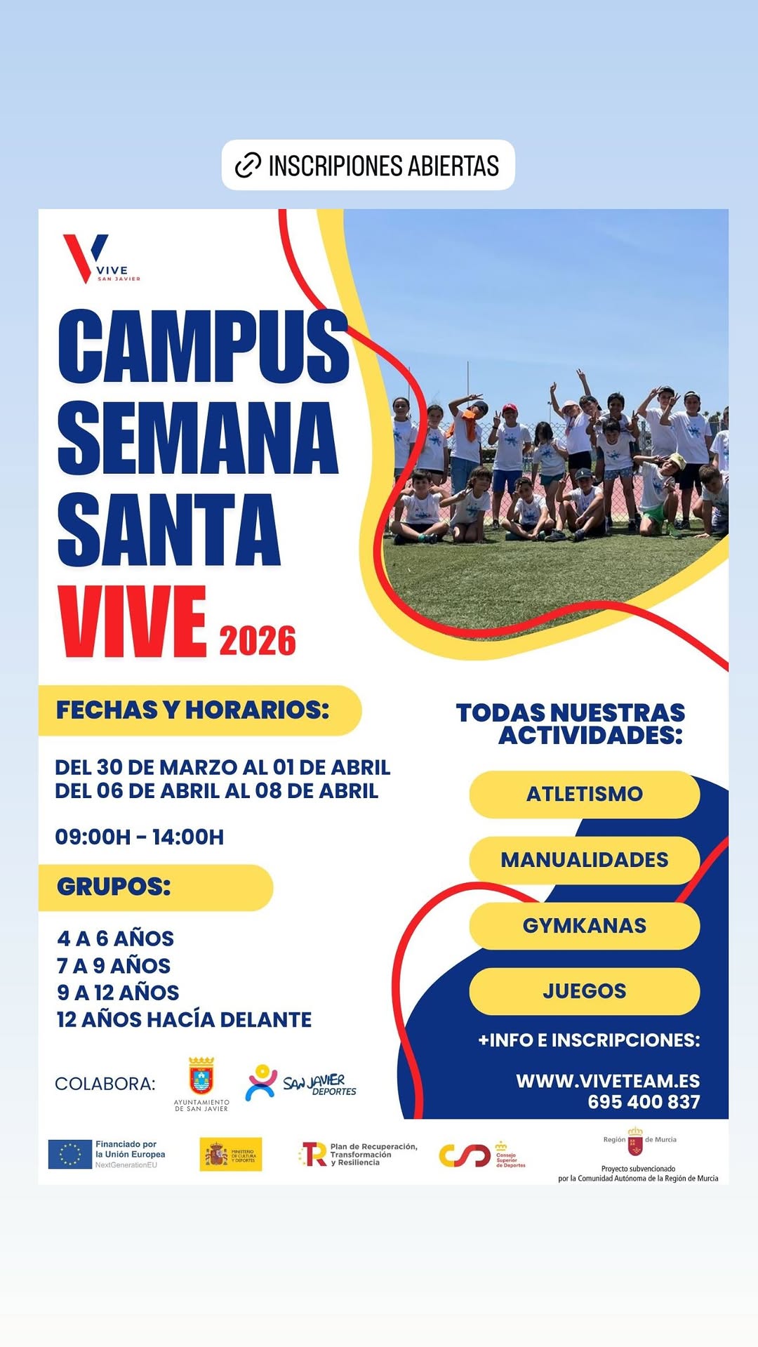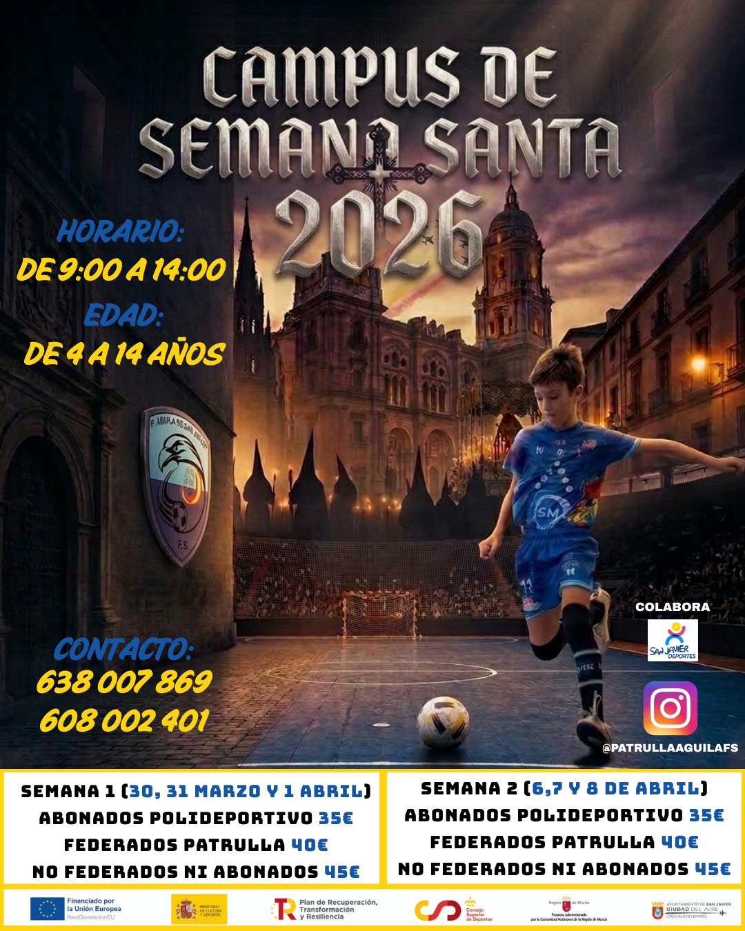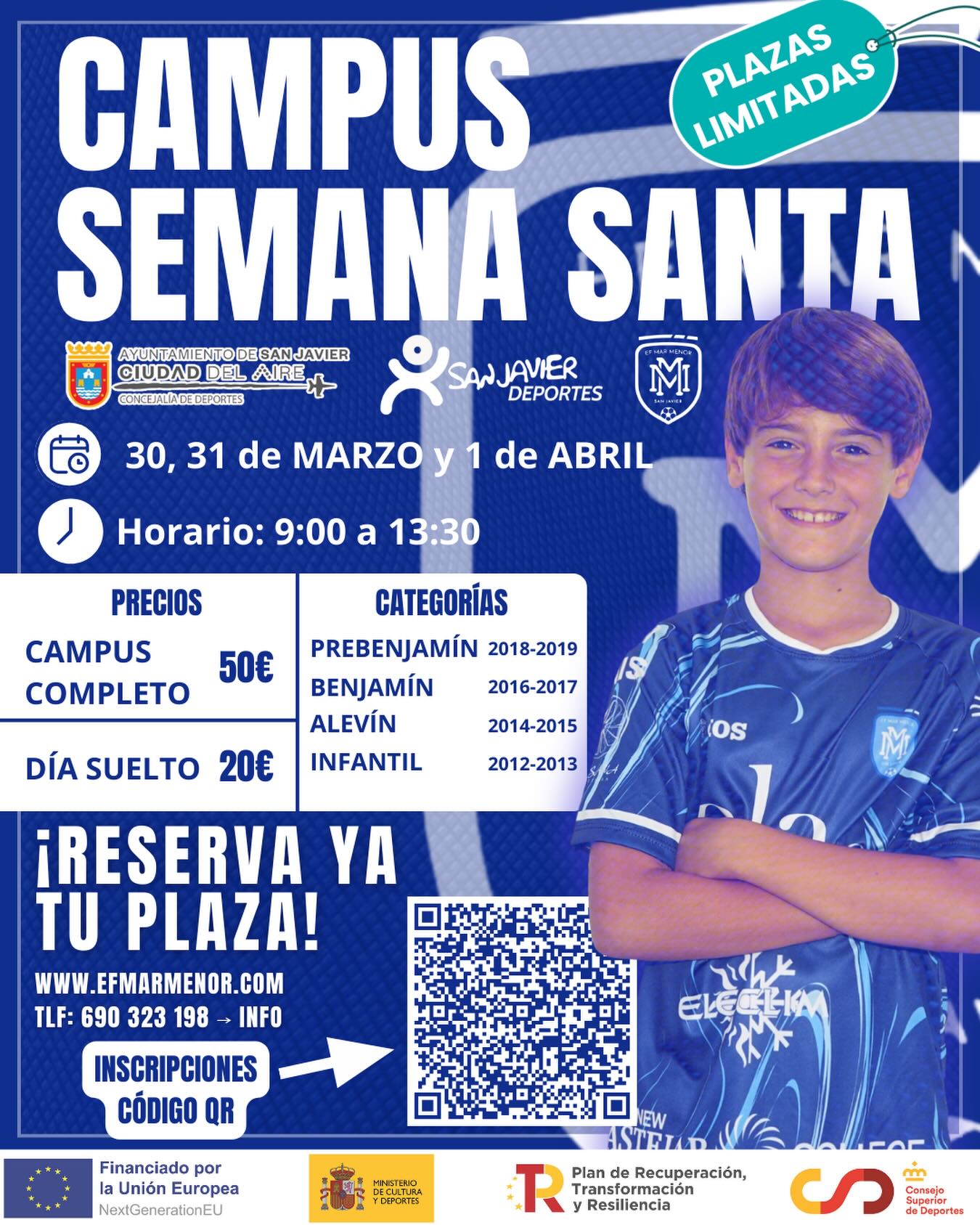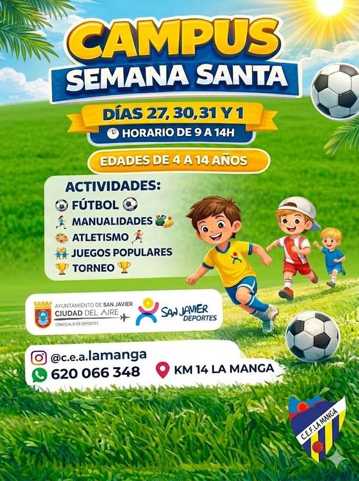 Atletismo, fútbol, fútbol sala y baloncesto, son los 5 campus que se celebrarán en los diferentes centros deportivos de San Javier esta Semana Santa: ofrecen diferentes especialidades y disciplinas deportivas en diferentes horarios, turnos y niveles, concebidos para que se puedan adaptar a las necesidades de las familias: