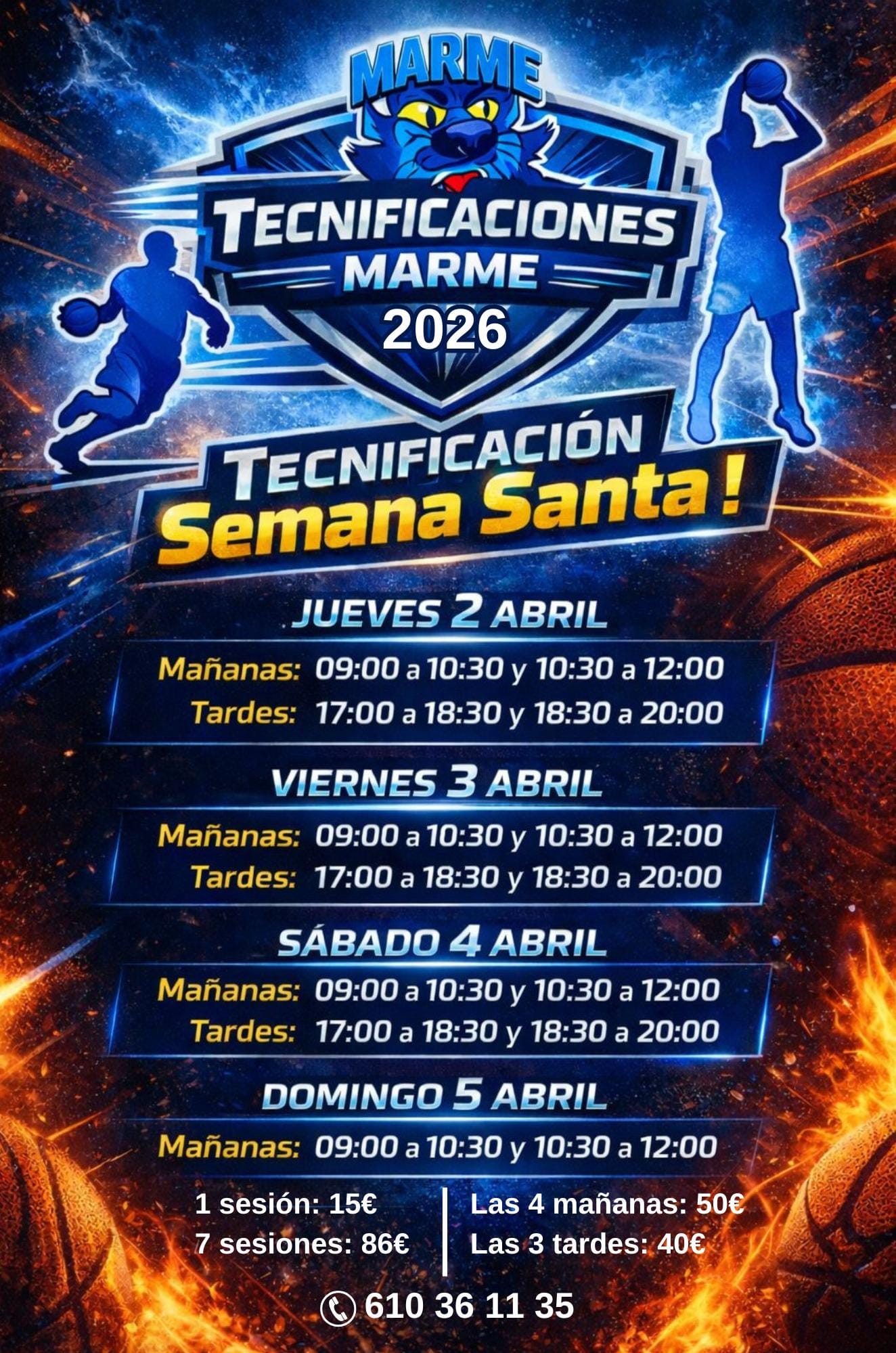 Precio: 1 sesión 15, 7 sesiones 86 e; Las 4 mañanas, 50 e; Las 3 tardes: 40e.