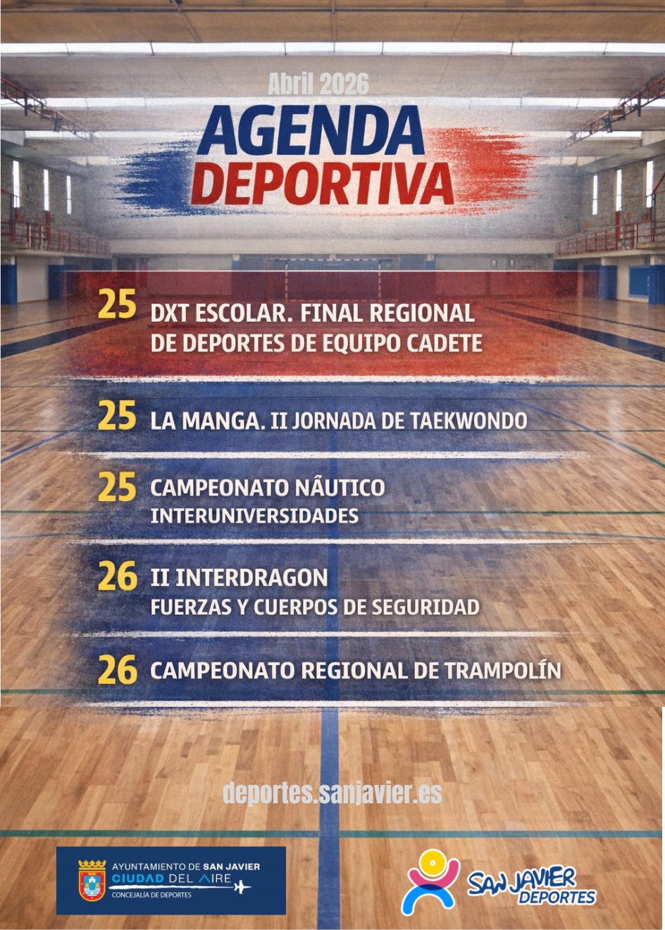 La actividad comenzará con la Final Regional de Deportes de Equipo en categoría cadete. El sábado 25 de abril, el Polideportivo Municipal de San Javier, junto a los pabellones de El Mirador y del IES Ruiz de Alda, acogerán los encuentros decisivos para coronar a los mejores de la Región. La competición se desarrollará desde las 09:00h hasta las 13:00h, culminando con la entrega de trofeos a mediodía.
