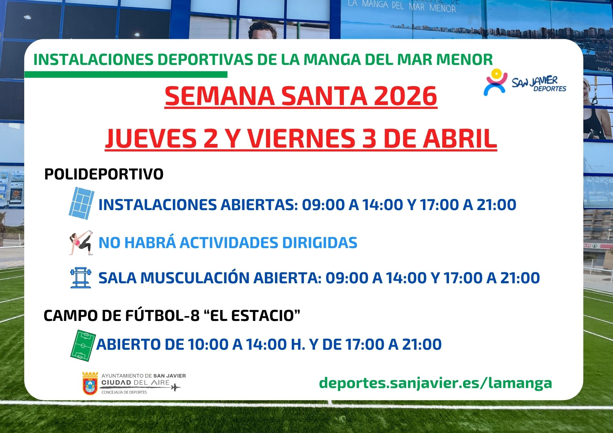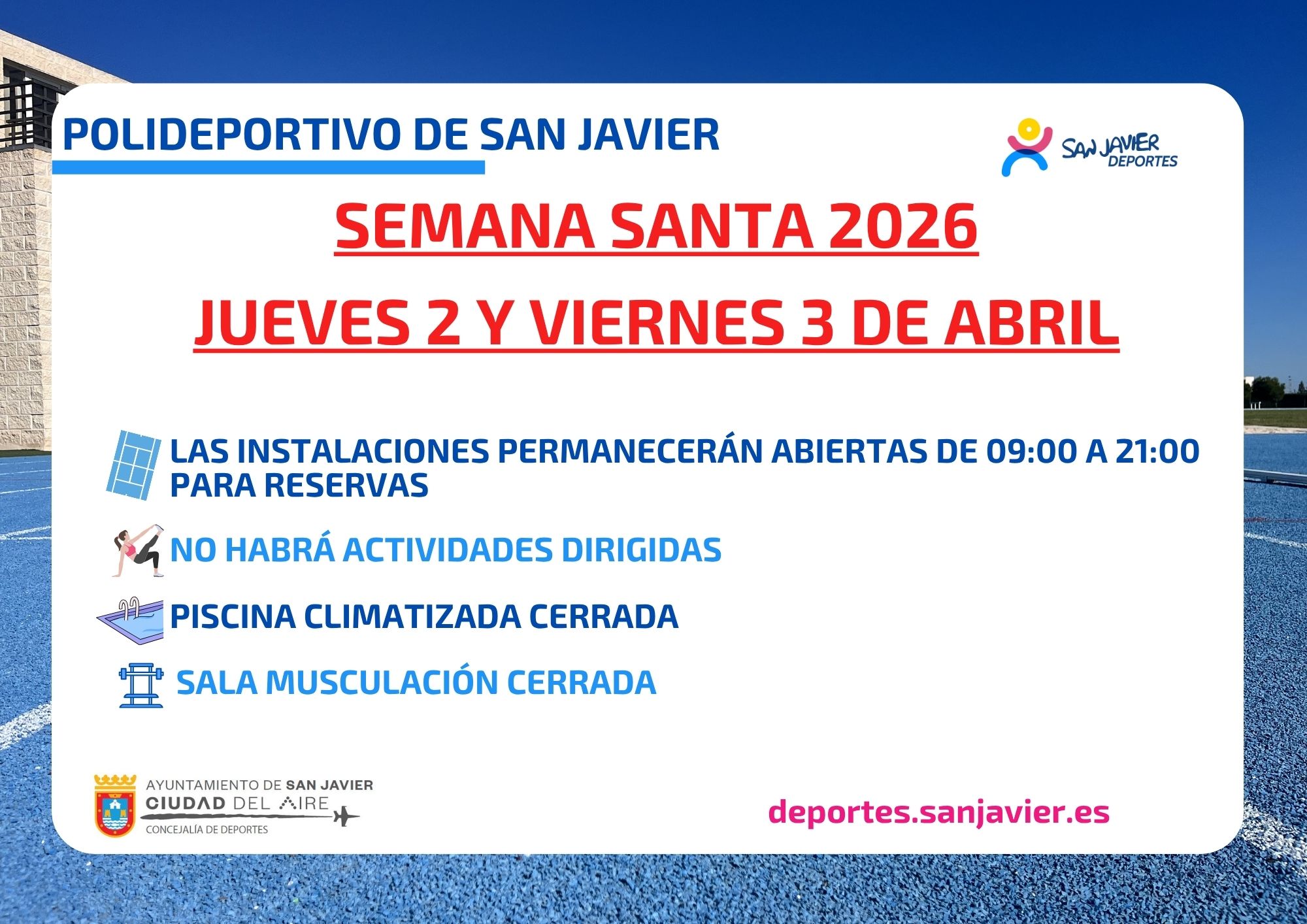 La Concejalía de Deportes del Ayto. de San Javier, informa que, el jueves 2 y viernes 3 de abril, con motivo de la Semana Santa:
