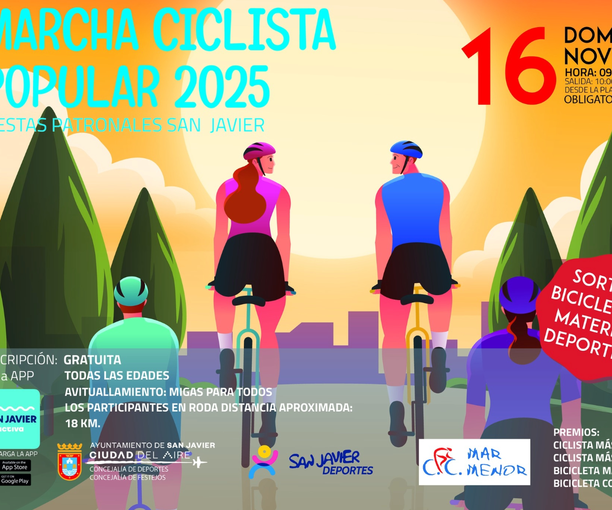 Marcha Ciclista Popular 2025 Fiestas Patronales El domingo, 16 de noviembre de 2025: Concentración: 09.30h. Plaza del Ayto. de San Javier; Salida: 10h. San Javier Más Información