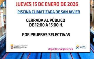 El jueves 15 de enero de 2026, la Piscina Climatizada de San Javier estará cerrada al público, de 12 a 15h., por pruebas selectivas. Disculpen las molestias. [...]