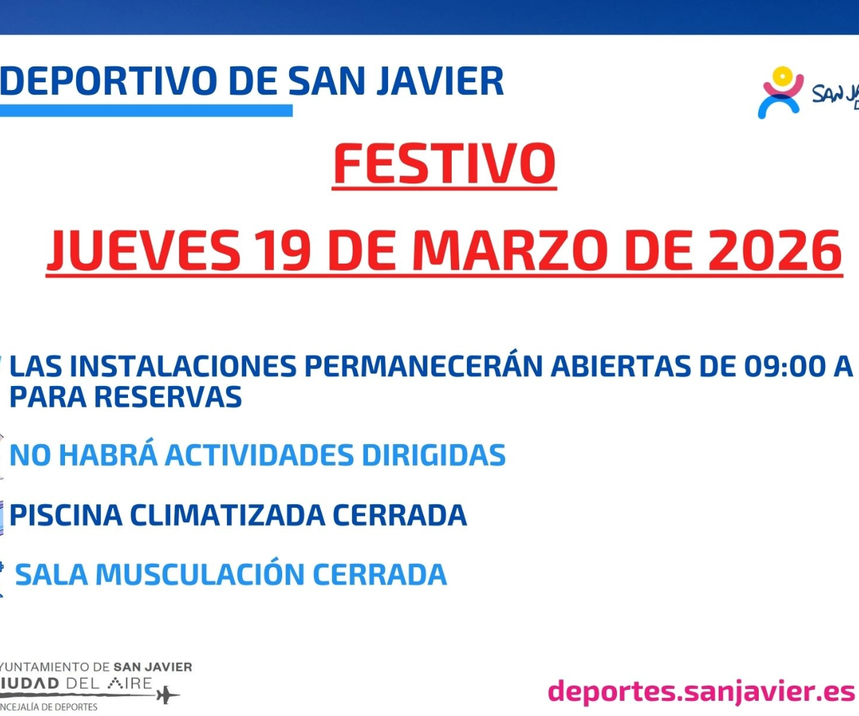 Rafa2026-03-20T07:43:20+01:00El próximo jueves, 19 de marzo de 2026, día de San José, es Festivo: La Concejalía de Deportes informa que: Polideportivo de San Javier: Las instalaciones permanecerán abiertas de 09h a 21h. para reservas No habrá actividades dirigidas La piscina climatizada estará cerrada La sala de musculación estará cerrada Polideportivo La Manga del Menor: -El Polideportivo de La Manga tendrá sus instalaciones abiertas de 09 a 14h. No habrá actividades dirigidas La sala de musculación estará abierta de 09 a 14h. El campo de fútbol 8 "El Estacio": Estará abierto de 10 a 14h. Disculpen las [...]